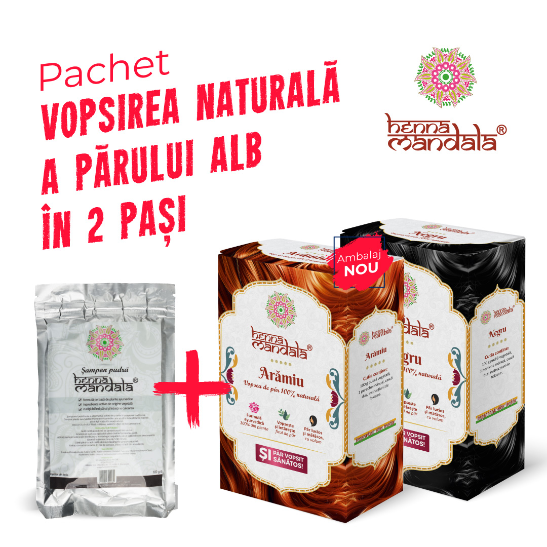 Vopsirea în 2 pași presupune vopsirea părului de 2 ori. La prima vopsire folosește henna pură (arămiu) care prinde foarte bine pe părul alb și în această situație acționează ca o bază. A doua oară vopsește părul cu culoarea de castaniu dorită care conține indigo și se leagă foarte bine de henna. Astfel, culoarea finală devine mai uniformă. Te poți vopsi în aceeași zi sau în 2 zile consecutive. Aplici arămiu pe părul proaspăt spălat și uscat, îl lași să acționeze 1-3 ore apoi îl limpezești bine cu apă. Îl usuci și aplici nuanța de castaniu aleasă. Lași să acționeze alte 1-3 ore și clătești foarte bine cu apă. Folosește șamponul pudră ayurvedic începând cu 2 zile după vopsire pentru întreținerea culorii. Acesta acționează atât ca un șampon curățând blând scalpul cât și ca un balsam descurcând părul în mod natural.